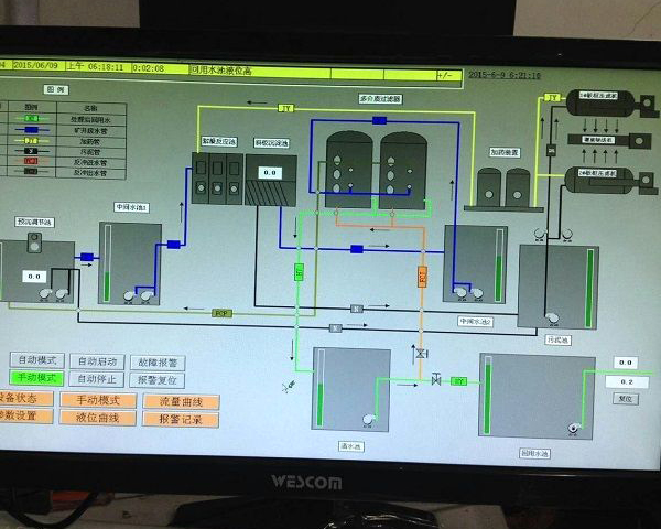 工藝技術(shù)參數(shù)可在工控機或觸摸屏上進行修改;在線監(jiān)控主要包括進水和出水水質(zhì)、水溫、處理流量、加藥流量、水池液位和加藥設(shè)備液位等,各液位和水泵、電動閥門等動力設(shè)備實現(xiàn)聯(lián)鎖控制,自動開停設(shè)備,自動報警。將整個處理過程中的各種運行參數(shù)以圖形及文字方式動態(tài)顯示在工控機或觸摸屏上,操作界面非常直觀。